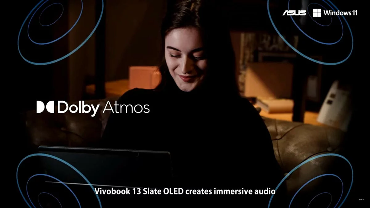 Так как Vivobook 13 Slate OLED идеально подходит для просмотра фильмов, производитель уделил внимание и звуку. Четыре динамика с поддержкой технологии пространственного звучания Dolby Atmos обеспечат качественный и объемный звук.