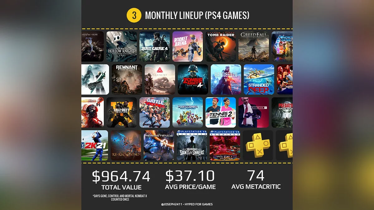 Также реддитор посчитал общую цену розданных игр для PS4, большинство из которых можно запустить на PS5 по обратной совместимости. За пошедшие 12 месяцев обладатели PS4 получили 24 игры, включая 4 для PS VR. Вместе они стоят $965 (68,4 тысяч рублей), а их средняя оценка — 74/100 баллов.