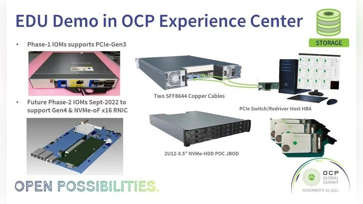 Суть в том, что этот накопитель использует интерфейс PCIe с протоколом NVMe, который обычно применяется в SSD. Для этого использован проприетарный контроллер, который также поддерживает SATA и SAS без дополнительных переходников. Специалисты компании показали подключение 12 жёстких дисков, которые работали через общий коммутатор PCIe.
