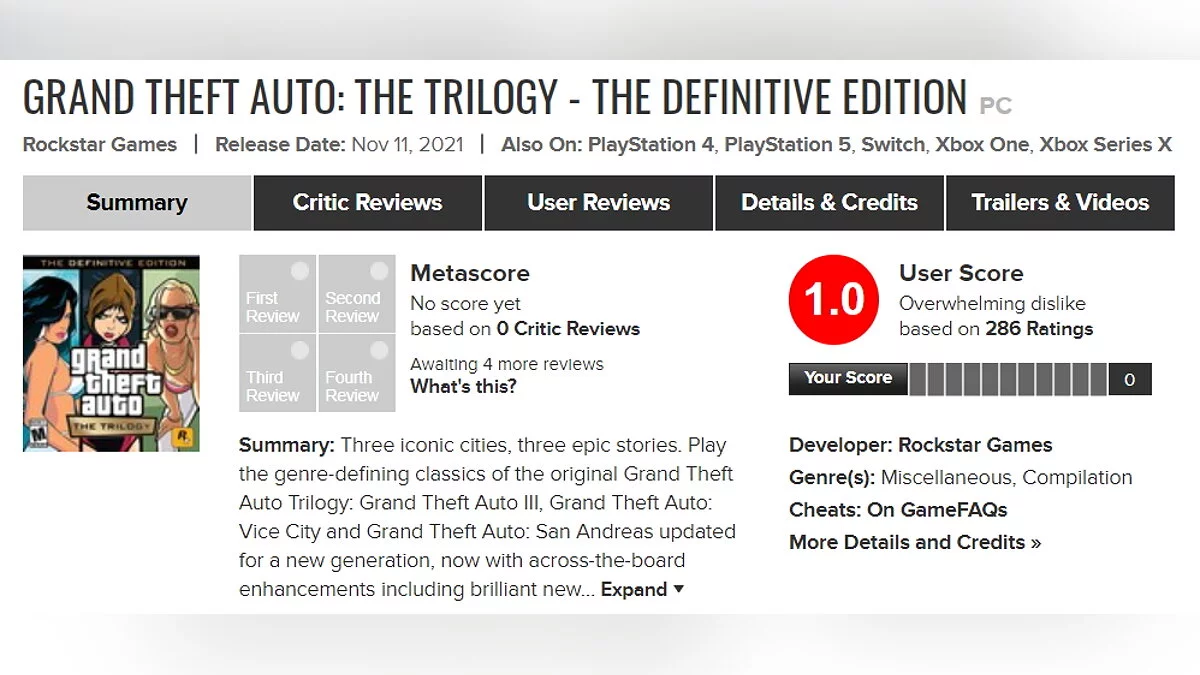 Сборник ремастеров GTA: The Trilogy — The Definitive Edition может стать одной из самых низко оцененных игр пользователями Metacritic в 2021 году.