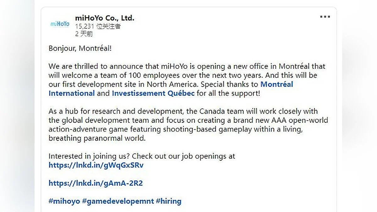Китайская компания miHoYo, создавшая популярную Action/RPG Genshin Impact, сообщила об открытии студии в канадском городе Монреаль. Слухи об этом появились несколько месяцев назад, а теперь они подтвердились.