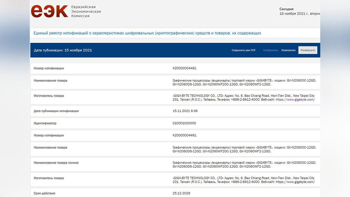 Gigabyte указала в базе данных Европейской экономической комиссии сразу 4 модели видеокарт с 12 ГБ памяти GDDR6. Предполагается, что они появятся в конце текущего или начале будущего года.