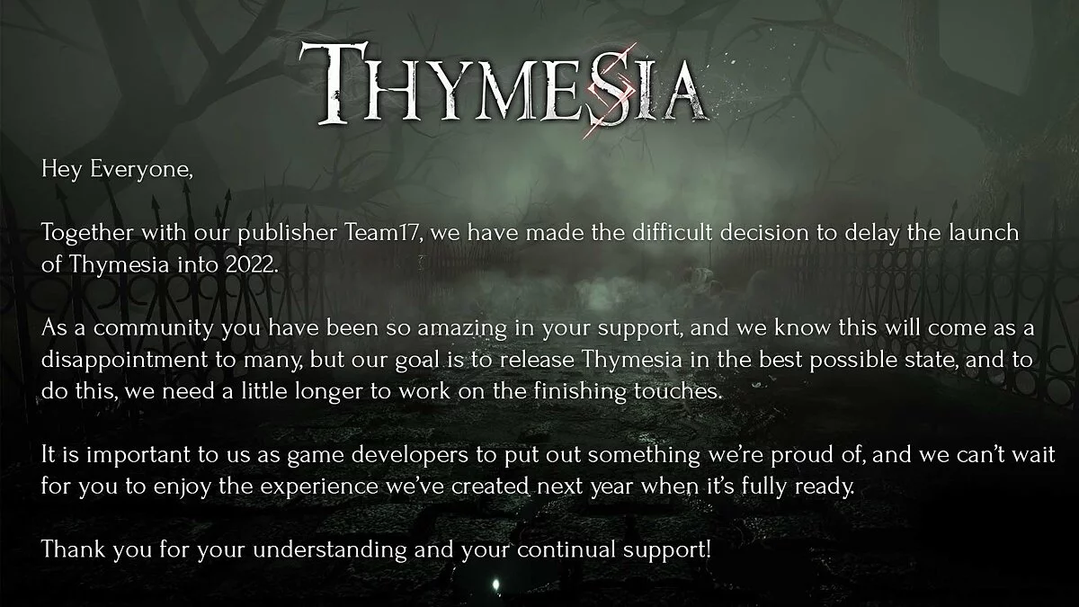 Сюжет Thymesia расскажет о Корвусе, наполовину человеке, наполовину вороне. Герою предстоит узнать причину трагической катастрофы, из-за которой некогда процветающее королевство наводнили ужасные чудовища и погрузили его в хаос. Во время прохождения игрокам предстоит принять несколько сложных решений, от которых будет зависеть концовка ролевого экшена.
