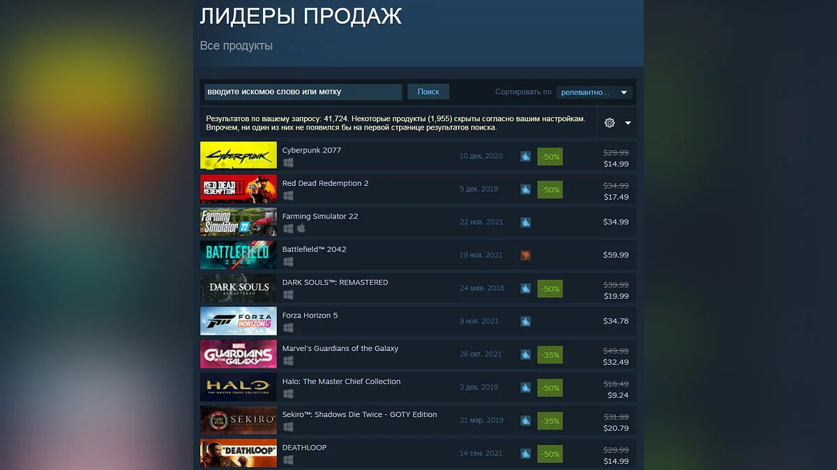 В рамках грандиозной осенней распродажи Steam ролевая игра Cyberpunk 2077 получила скидку 50% — сейчас её можно приобрести за 999 рублей. Это крупнейшая скидка на игру в Steam с момента её релиза. Благодаря акции RPG удалось попасть на первое место в топе продаж магазина.