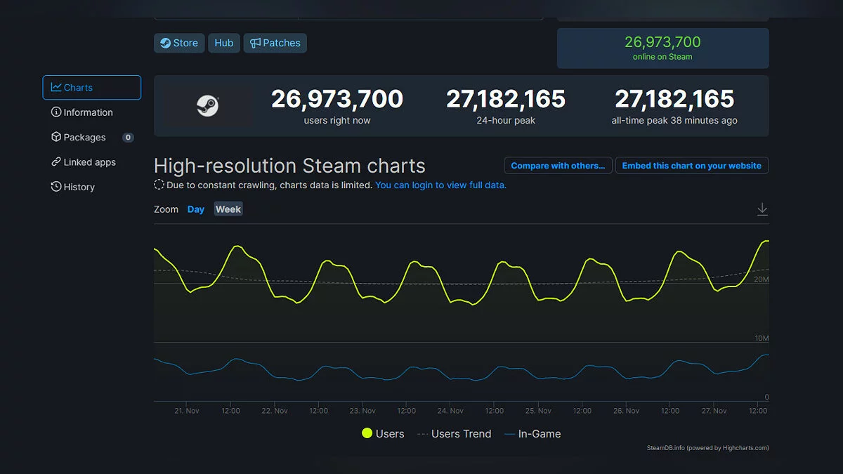 В магазине Steam зафиксирован новый рекорд — по состоянию на сегодняшний день, 27 ноября, пик одновременного онлайна составил 27 182 165 пользователей.