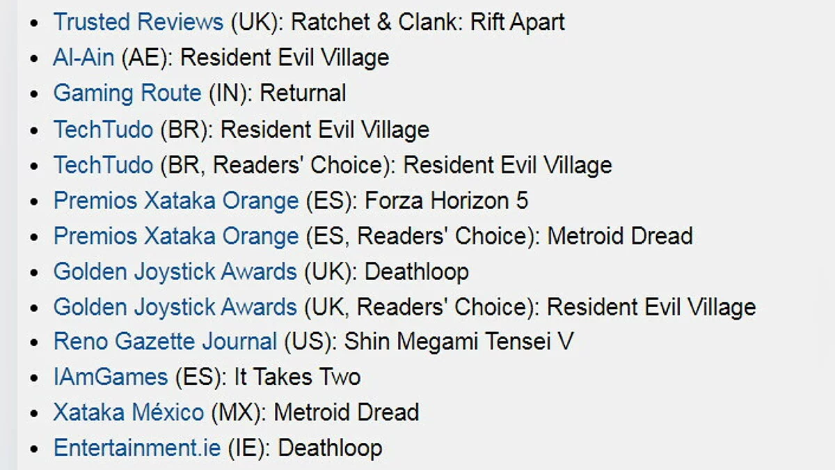 Западные игровые издания уже начали выбирать лучший проект 2021 года. На данный момент сайт gameawards.net зафиксировал 13 наград «Игра года». Некоторых их них были присвоены прессой, другие — голосованием игроков.