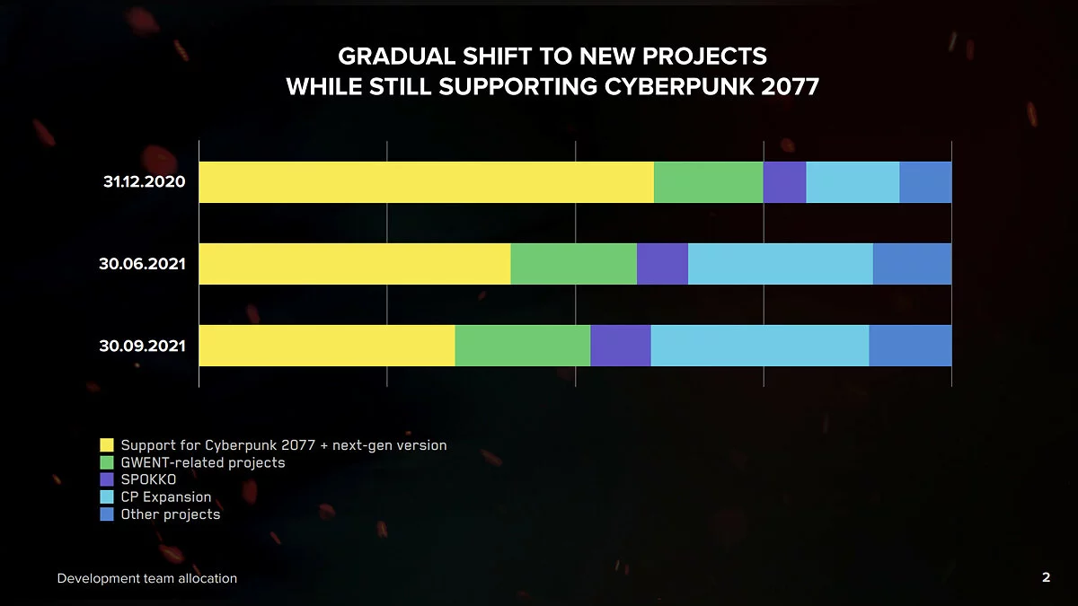 На инфографике указана расстановка сил внутри студии. Желтый цвет — работа над патчами для Cyberpunk 2077; зеленый — проекты, связанные с «Гвинтом»; фиолетовый — мобильная The Witcher: Monster Slayer; голубой — дополнения для Cyberpunk 2077; синий — другие проекты.