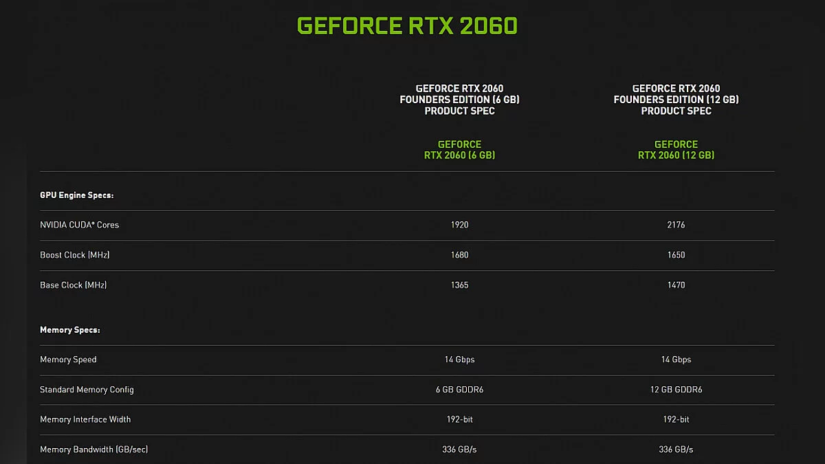 Компания NVIDIA раскрыла полные спецификации будущей видеокарты RTX 2060 12GB Founders Edition. Судя по ним, новинка почти не отличается от RTX 2060 Super, выпущенной в июле 2019 года.