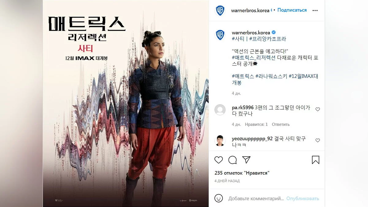 Российская премьера «Матрицы: Воскрешение» намечена 16 декабря. Через шестьдней фильм появится в стриминговом сервисе HBO Max.