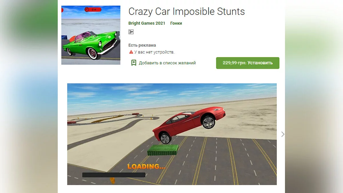 - Crazy Car Imposible Stunts — трехмерная гоночная игра, в которой можно выполнять различные трюки (загрузить бесплатно).