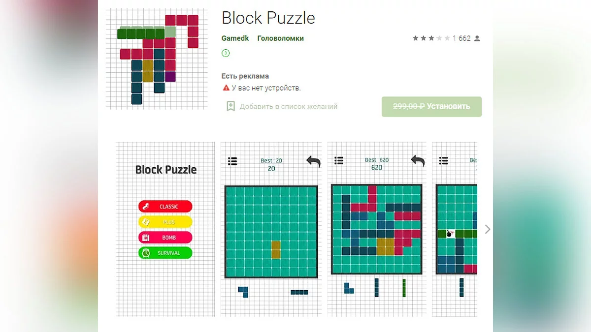 - Block Puzzle — головоломка с блоками, в которую можно играть одной рукой (загрузить бесплатно);