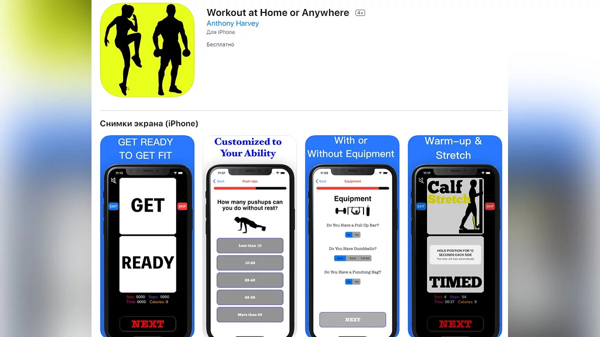 - Workout at Home or Anywhere — приложение, помогающее заниматься физическими упражнения (загрузить бесплатно).