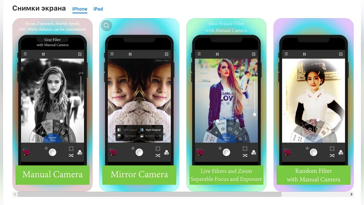 • Camera X _ Manual adjustments — довольно мощная программа для фотосъёмки с разными фильтрами (загрузить бесплатно).