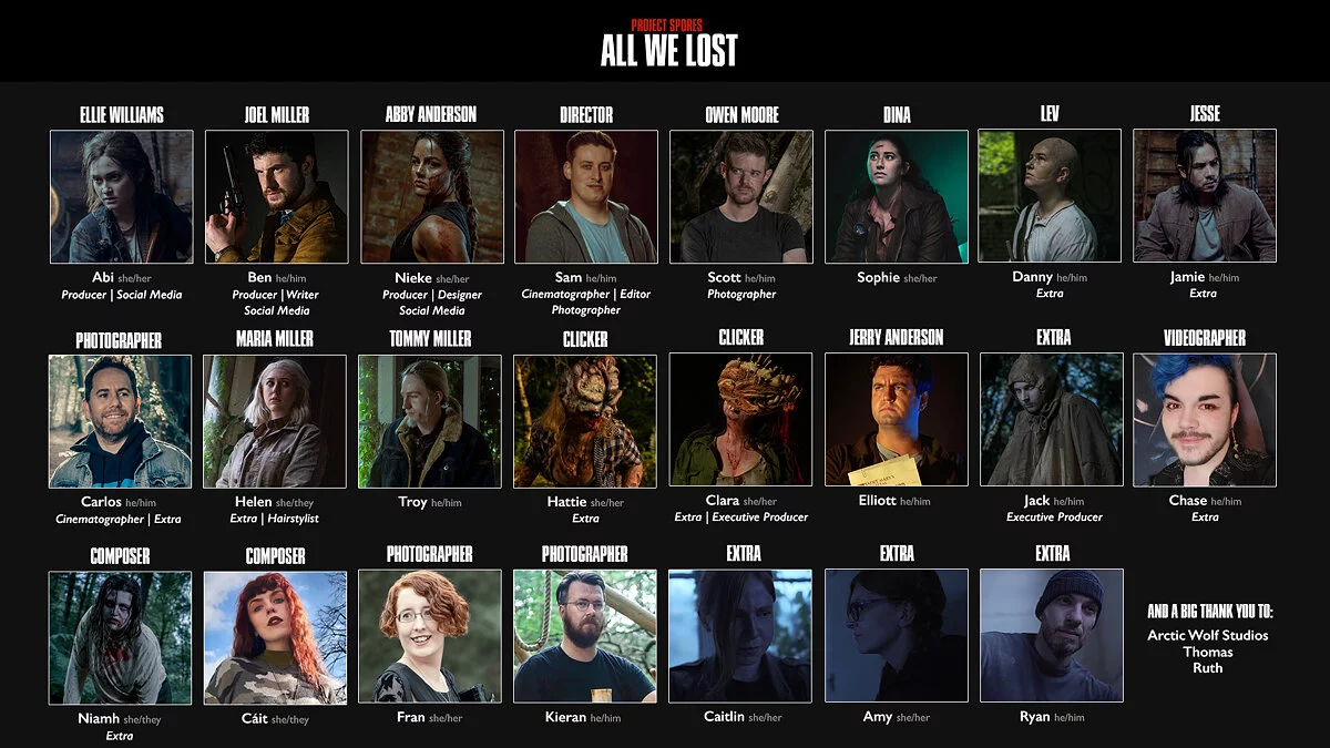 Создатели фанатского фильма по мотивам The Last of Us: Part 2 под названием Project Spores — All We Lost поделились в Twitter свежими кадрами со съёмок. На изображениях показали Элли, Джоэла, Томми, Марию и ещё 2 персонажей.