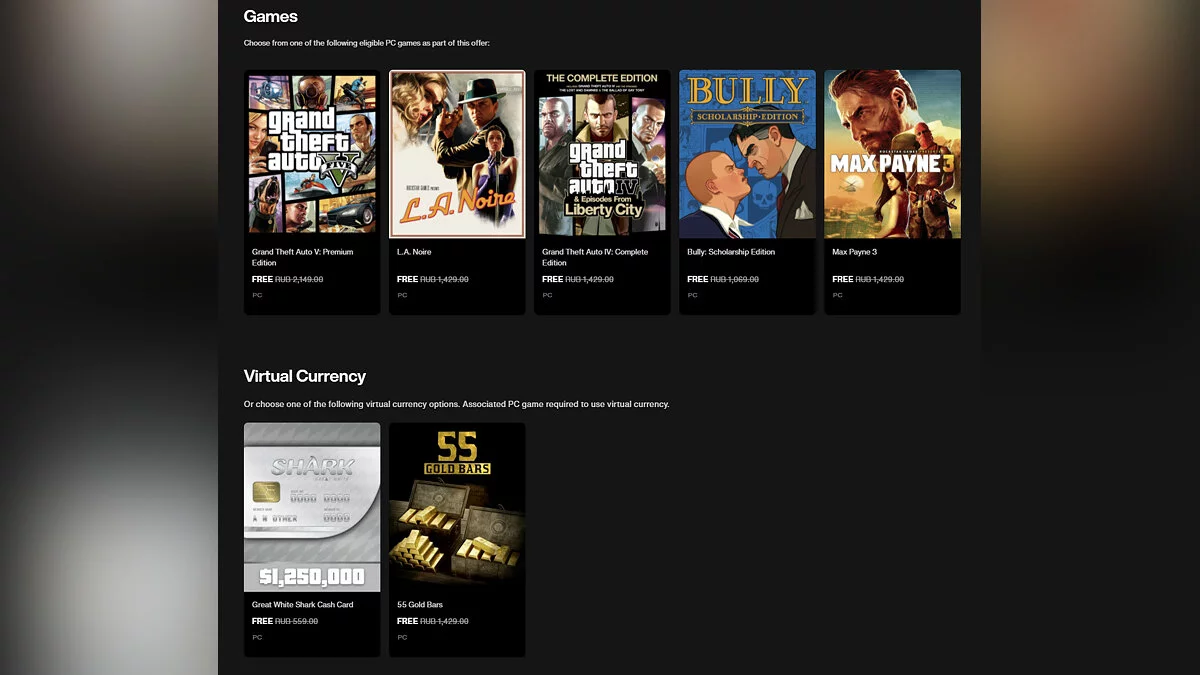 Забрать можно одну из пяти игр: GTA 4, GTA 5, Bully: Scholarship Edition, L.A. Noire и Max Payne. Если ни одна из игр не заинтересовала, можно взять 55 золотых слитков для Red Dead Online или 1,25 миллиона долларов на счет в GTA Online.