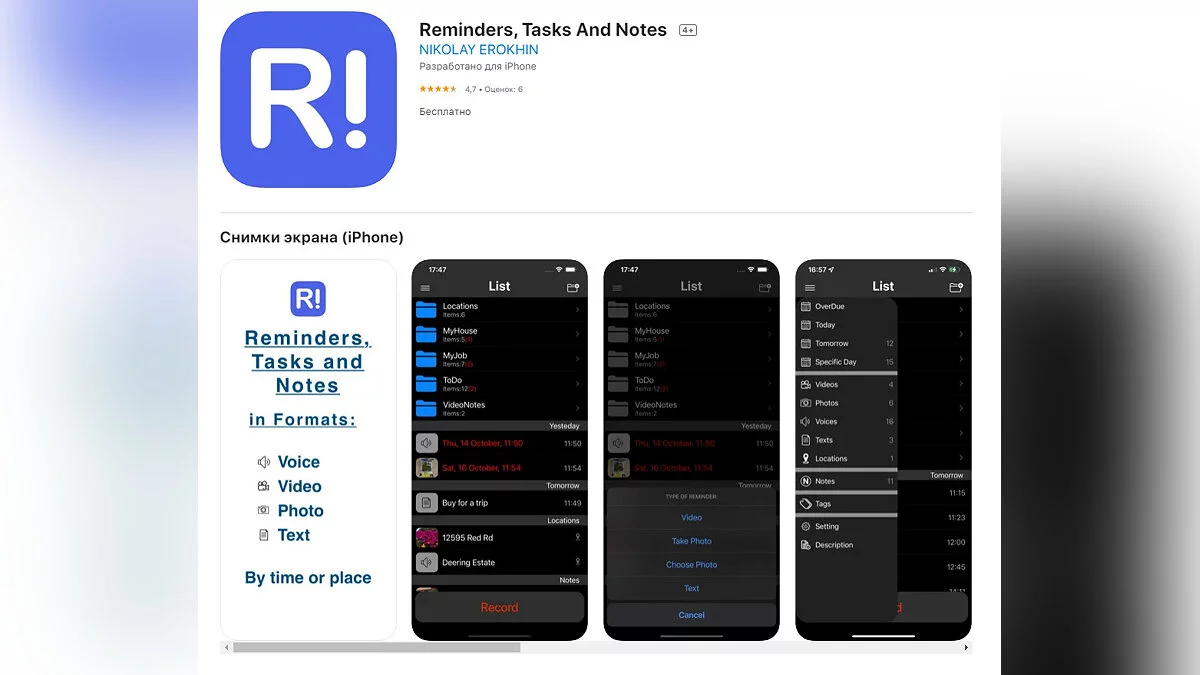 - Reminders, Tasks And Notes — приложение для заметок и напоминаний (загрузить бесплатно).