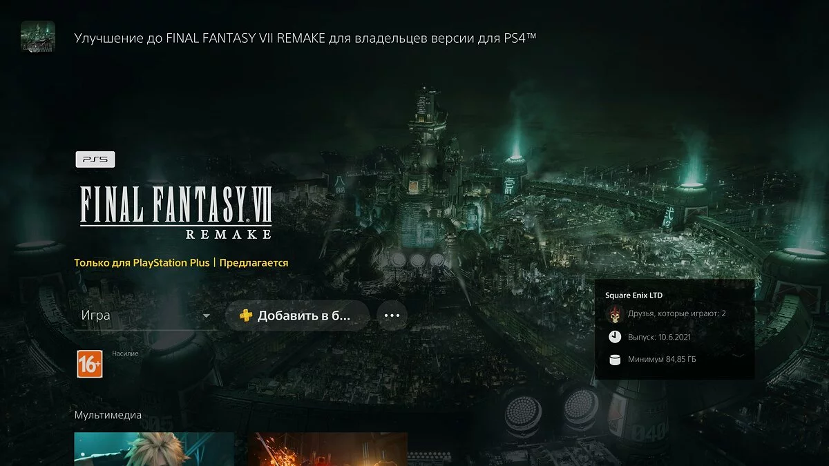 В PlayStation Store появился бесплатный апгрейд ремейка Final Fantasy VII для подписчиков PS Plus. Если вы брали игру по подписке, то сейчас можете обновить игру до версии для PlayStation 5.