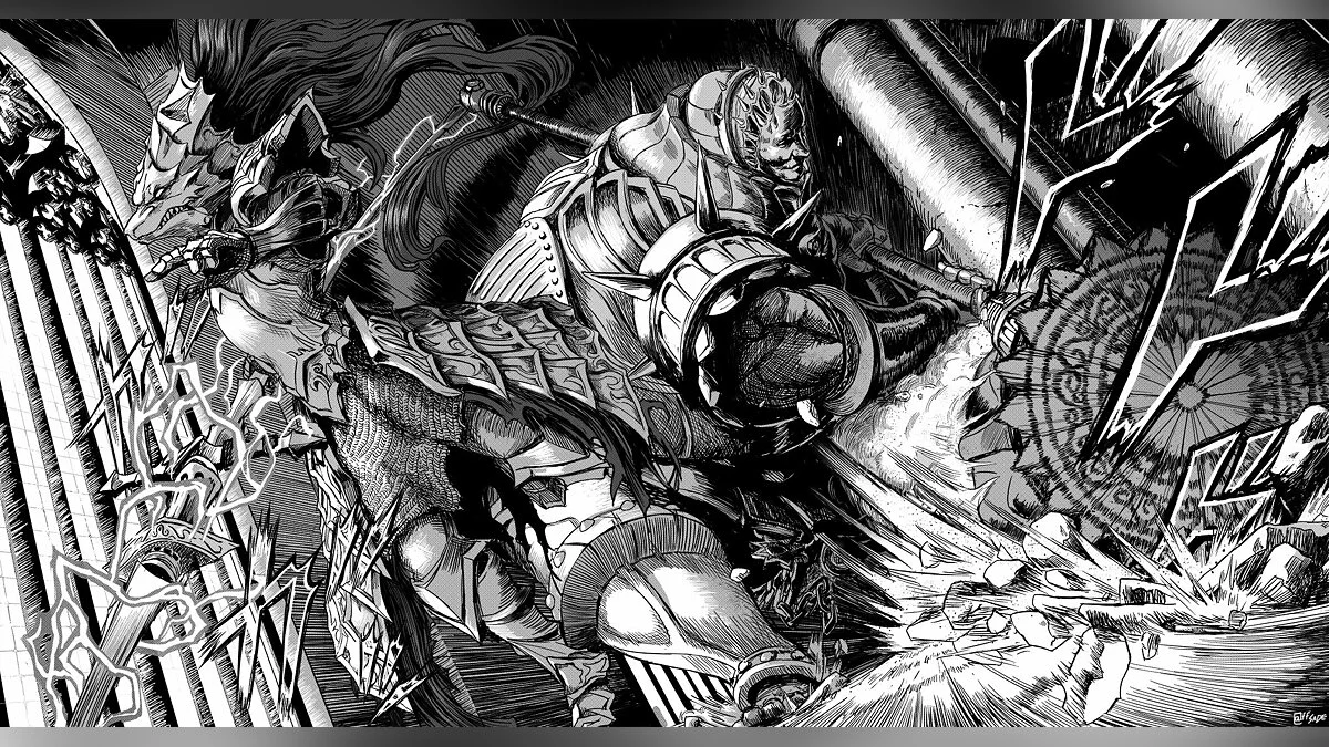 Художник с ником ffSade нарисовал арт, на котором изобразил боссов Орнштейна Драконоборца и Палача Смоуга из Dark Souls в стиле манги Кэнтаро Миура (Kentaro Miura) «Берсерк».