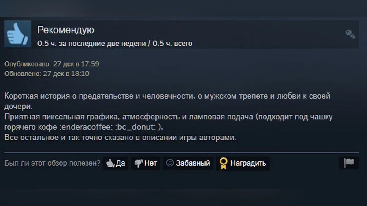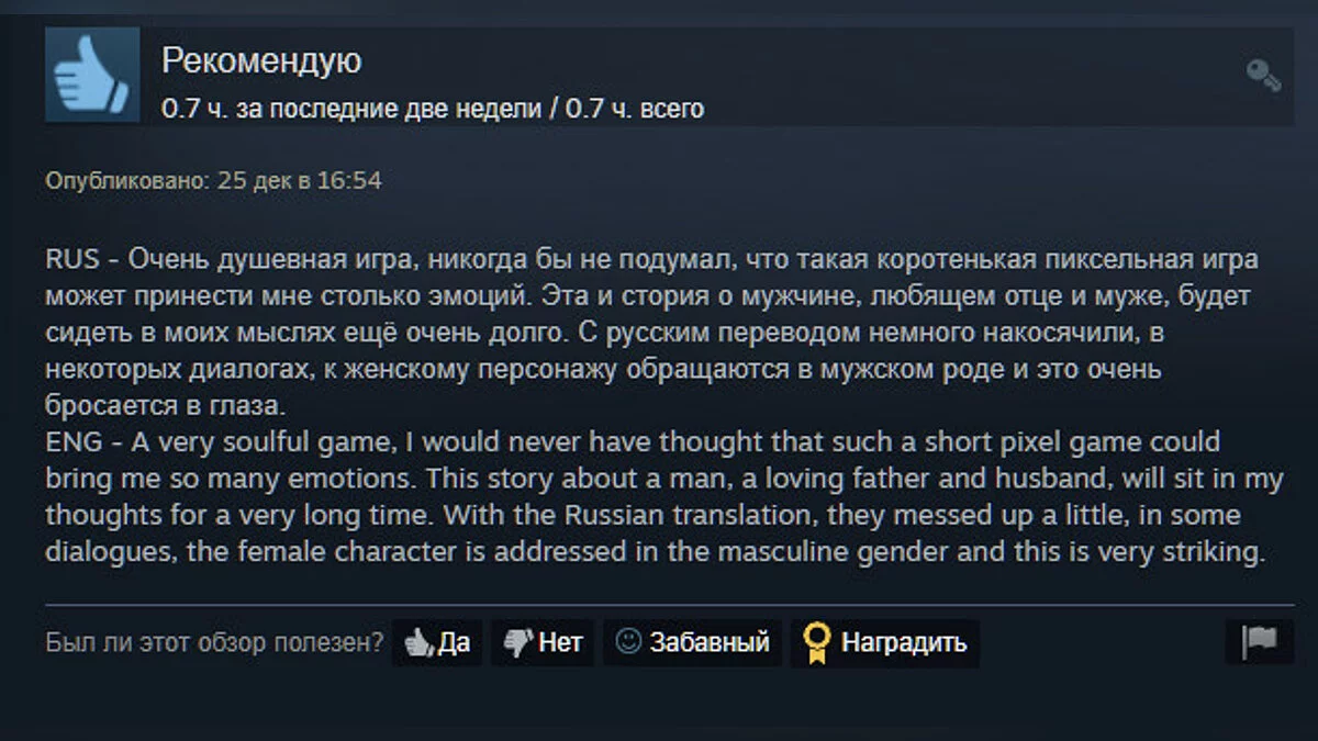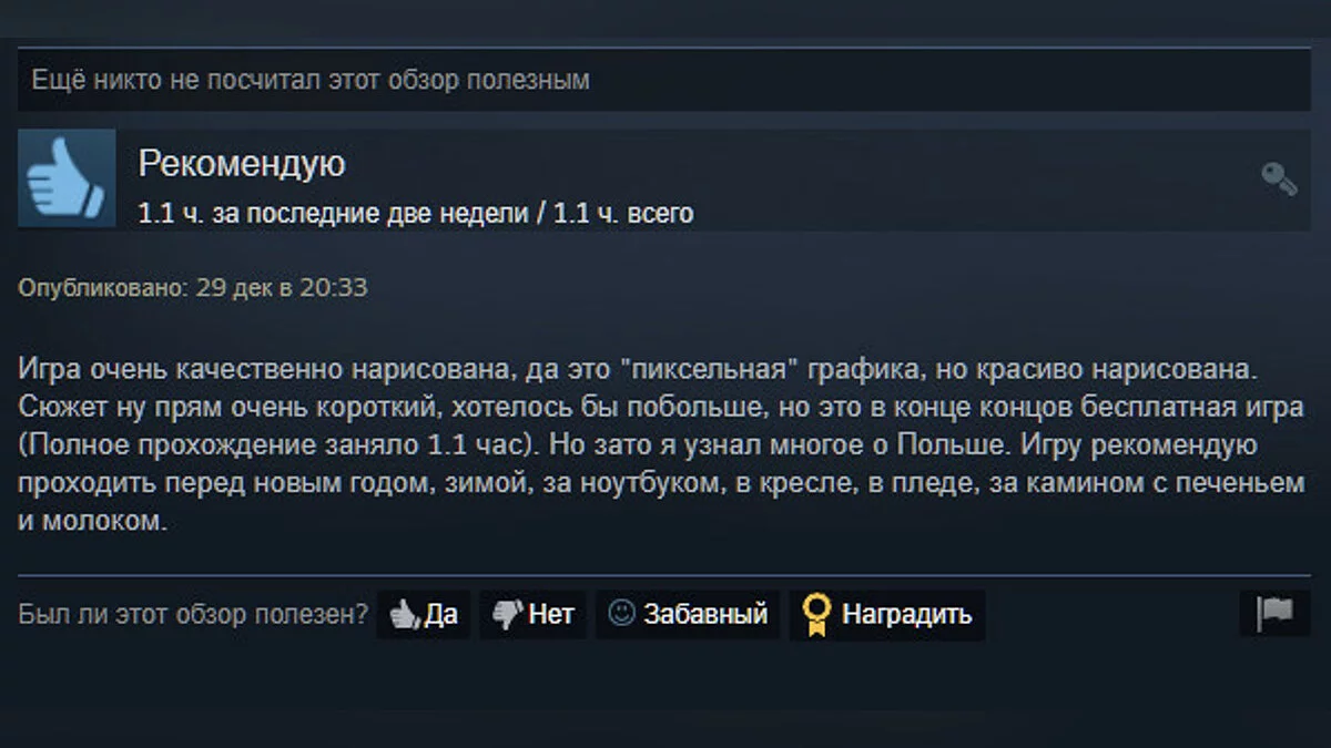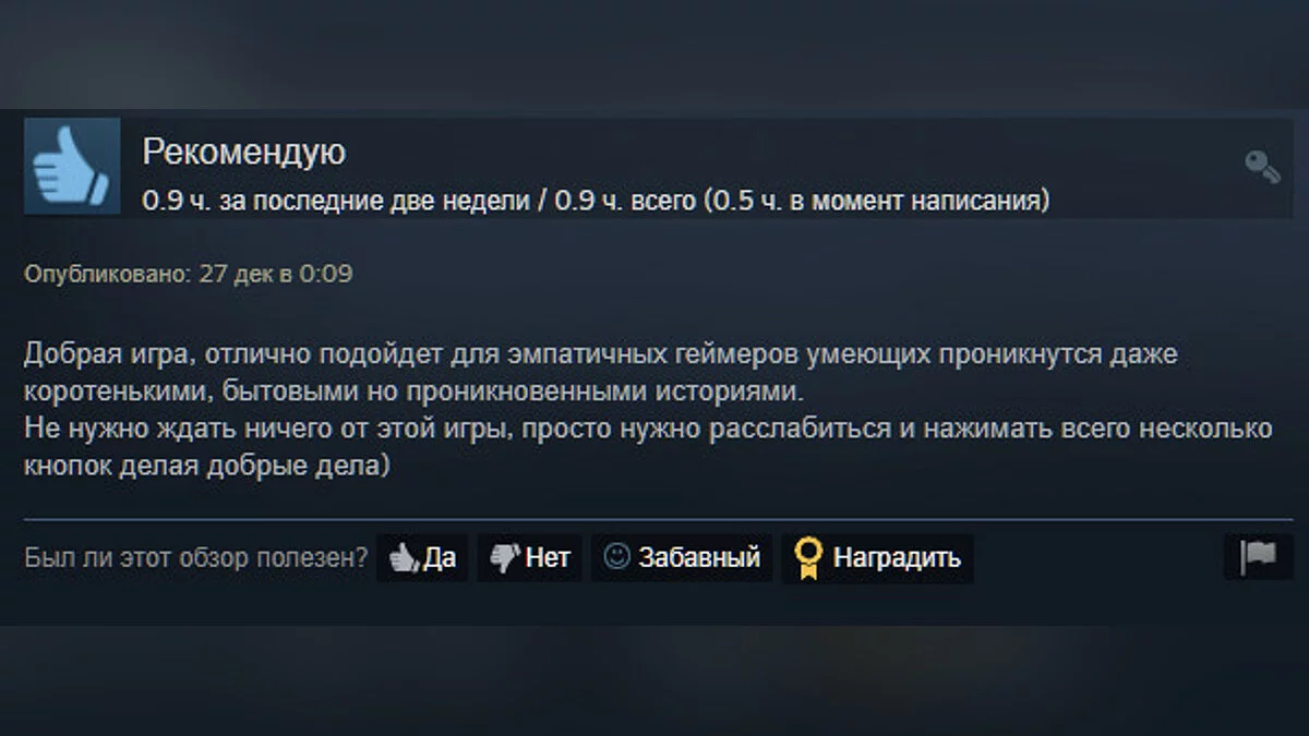 Проект имеет 95% положительных отзывов в Steam. Играть рекомендуют только под пледом и с кружкой чего-нибудь горячего.