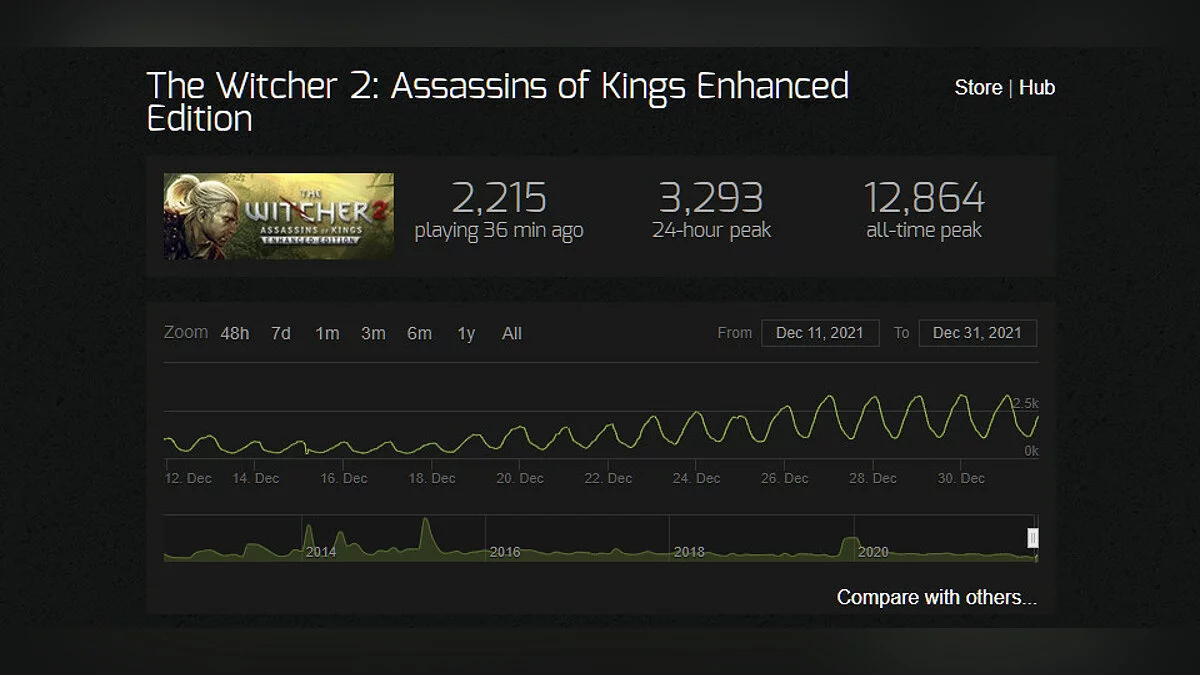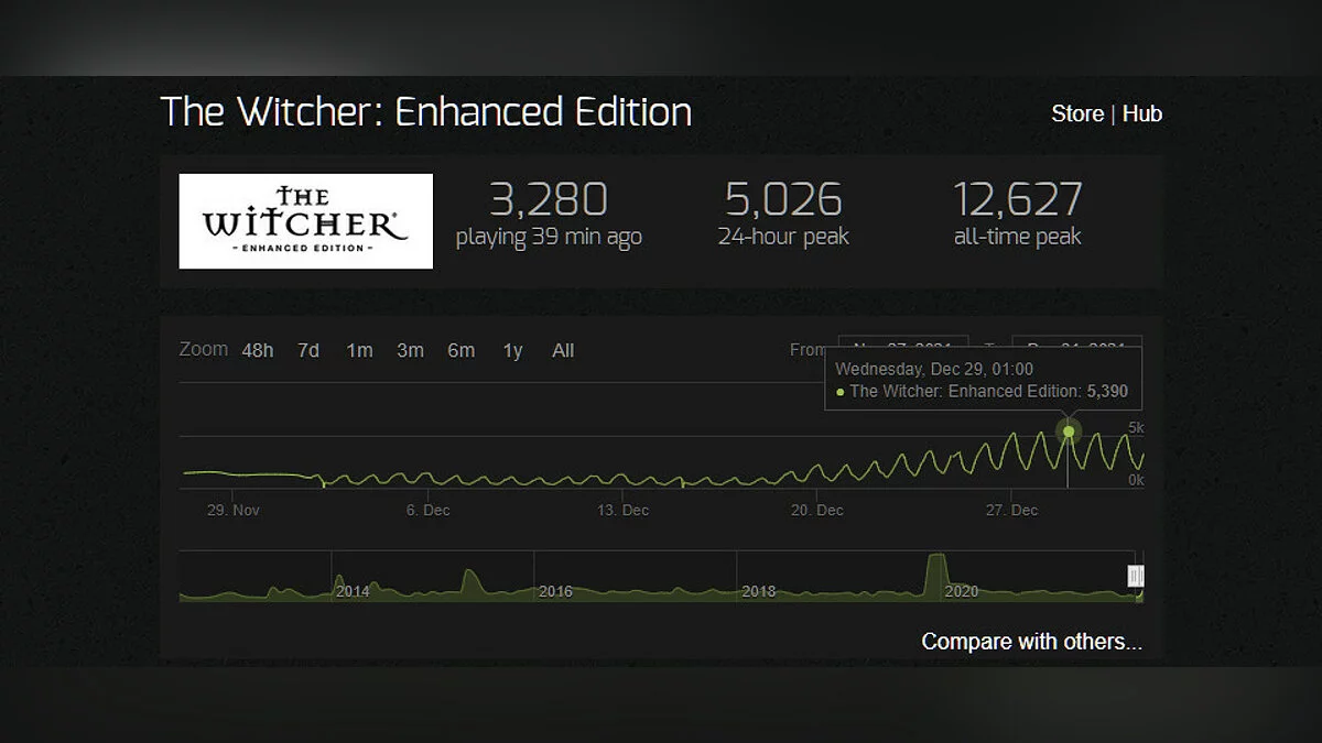 Похожую тенденцию можно заметить и в предыдущих частях. До премьеры нового сезона The Witcher 2 не набирала и тысячи человек онлайн. С 27 декабря он всегда превышает 3 тысячи человек.