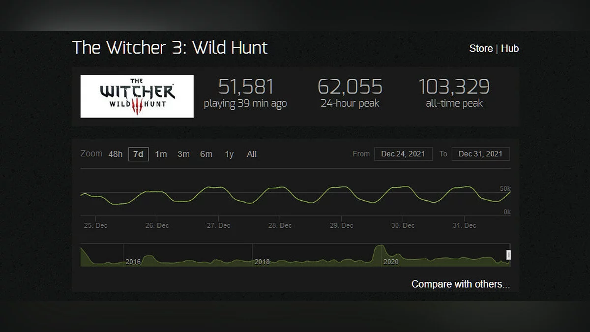30 декабря количество игроков в The Witcher 3 составило 62 тысячи. Это самый большой показатель с января 2020 года, когда вышел первый сезон. Кроме этого, 30 декабря «Дикая охота» вошла в в список самых популярных игр в Steam.