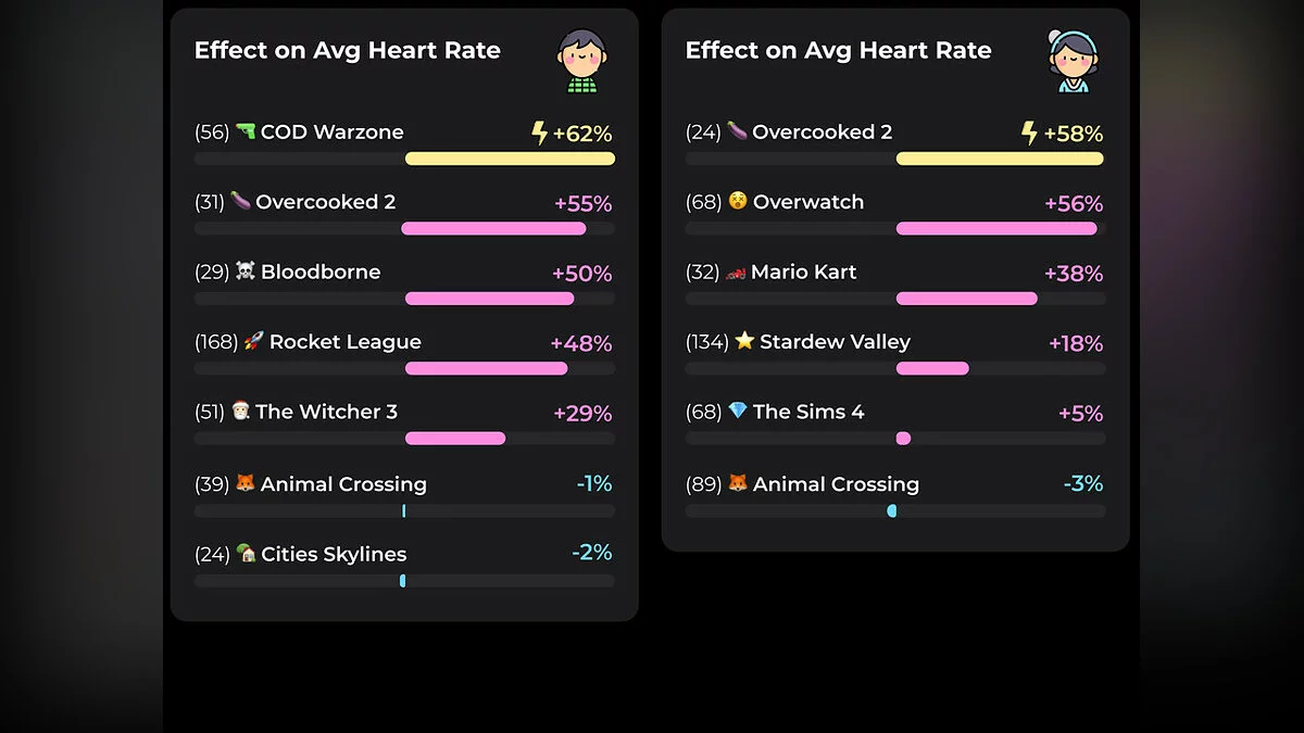 Девушка реддитора не играла Warzone и другие взрослые игры, а предпочла более семейные проекты. Больше всего на её пульс повлияла Overcooked 2. Недалеко ушла и Overwatch. Разница между этими играми составила всего 2%.