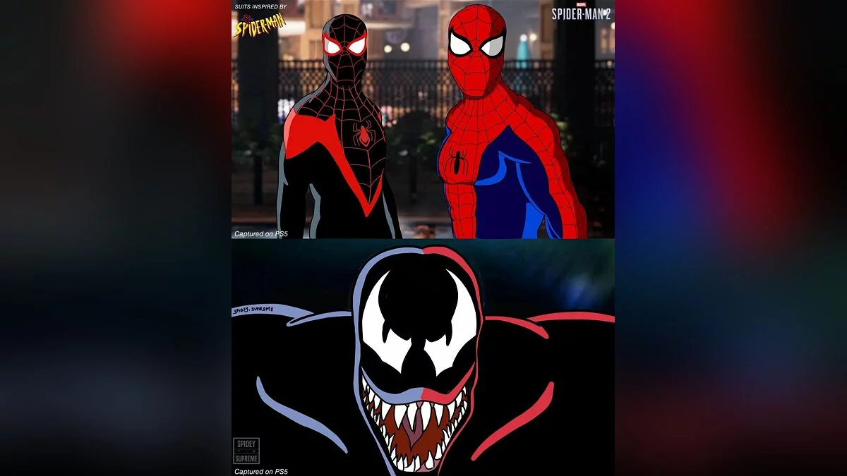 Ту самую сцену с Паучками и Веномом из Marvel's Spider-Man 2 показали в стиле мультика из 90-х
