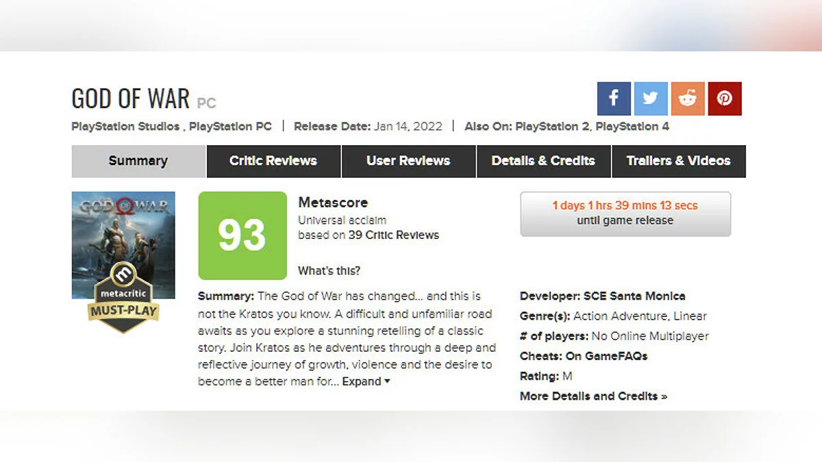 На Metacritic появились первые оценки PC-версии God of War, которая выходит уже послезавтра, 14 января. За порт можно не переживать: игра получила аж 93 балла — всего на один балл меньше, чем у оригинальной версии для PlayStation.