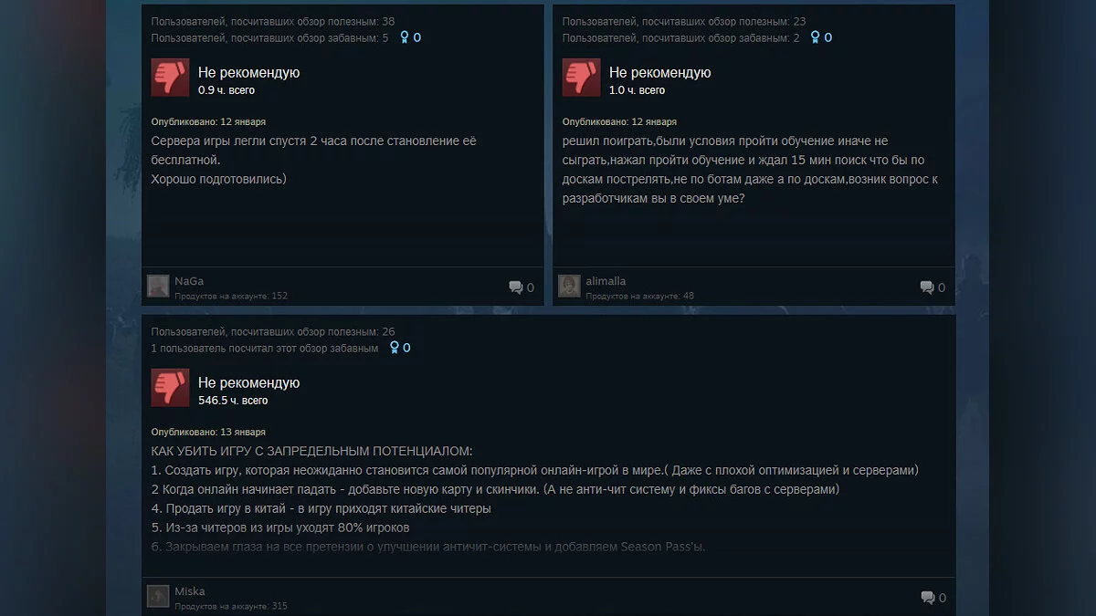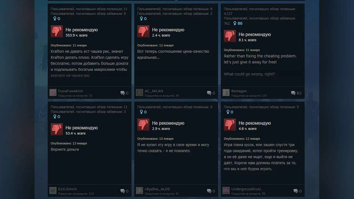 Позавчера, 12 января, PUBG: Battlegrounds стала бесплатной на всех платформах. И почти сразу же пользователи начали ругать игру, особенно на платформе Steam. Геймеры жалуются на плохую оптимизацию, технические проблемы, длительный поиск обязательных игр для обучения и другие проблемы.