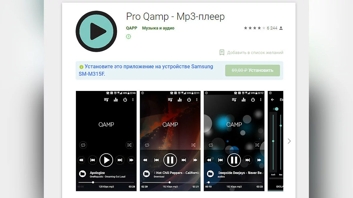 - Pro Qamp — Mp3-плеер — довольно мощный музыкальный плеер с 10-полосным эквалайзером (загрузить бесплатно).
