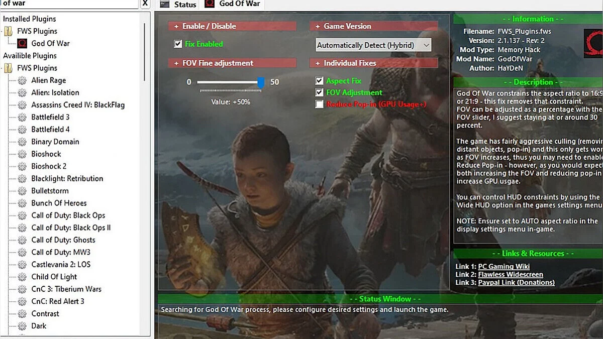 - Авторы утилиты Flawless Widescreen создали плагин, который позволяет увеличить поле зрения в God of War на 50%, в том числе не на ультрашироких мониторах. Для того, чтобы воспользоваться им, требуется скачать программу и настроить в ней плагин: включить параметры Fix Enabled и FOV Adjustment, а также указать желаемое увеличение FoV.