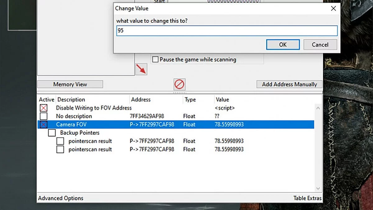 - Для того, чтобы воспользоваться модом, нужно открыть его в Cheat Engine, выбрать процесс God of War и активировать пункты Disable Writing to FOV Address и Camera FOV. После требуется указать нужное значение в поле Camera FOV. Преимущество этого способа заключается в том, что можно назначить горячую клавишу на отключение пользовательского FoV и просматривать катсцены с полем зрения по умолчанию.4