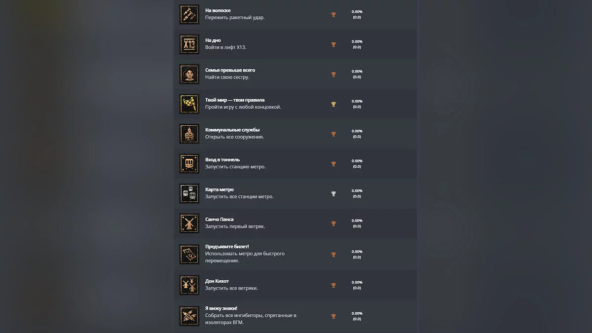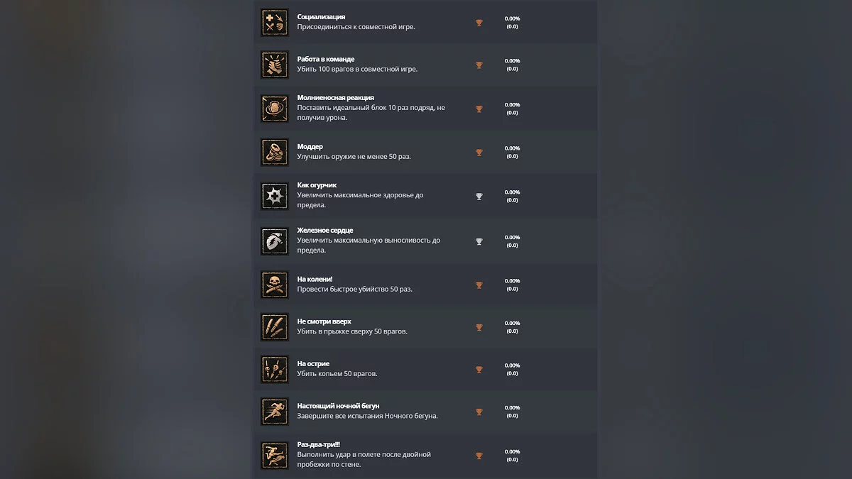 Все достижения можно выбить за одно прохождение, причем на любом уровне сложности. Кооперативный режим нужен только для двух трофеев.
