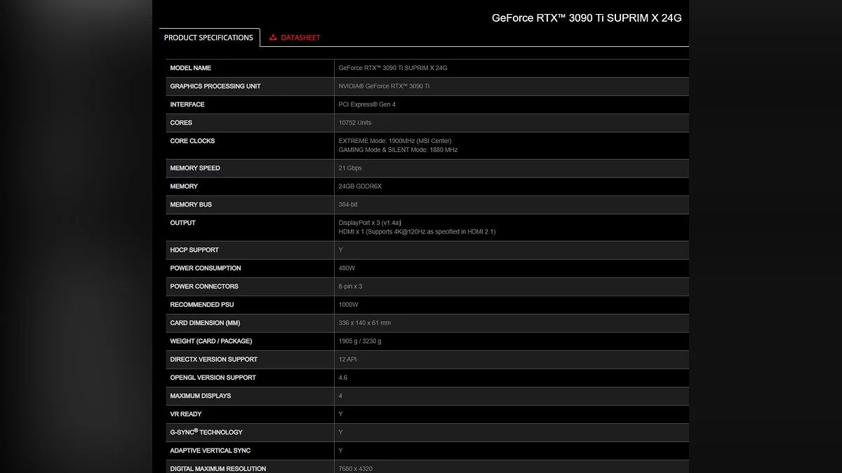 Если точнее, то паспортные показатели TGP (Total Graphics Power) составляют 450 Вт у базовой версии карты. У GeForce RTX 3090 Ti в исполнении Suprim X от MSI аналогичный показатель составит уже 480 Вт. Карта получит заводской разгон с частотой boost-режима GPU в районе 1880-1900 МГц и будет оснащена тремя 8-контактными разъёмами дополнительного питания.