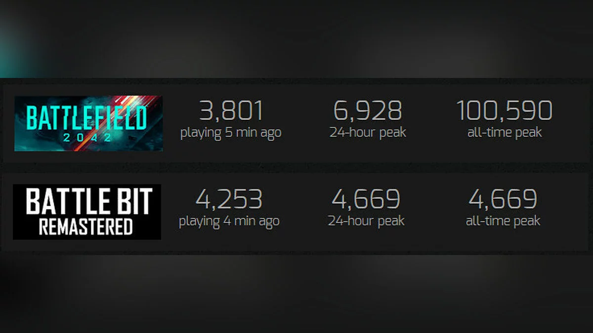 Инсайдер Том Хендерсон (Tom Henderson) поделился забавным наблюдением у себя в Twitter. Недавно вышедший в Steam шутер BattleBit Remastered, копирующий Battlefield 2042, стал популярнее своего родителя. В момент, когда Хендерсон следил за статистикой, онлайн BattleBit составил 4253 человека против 3801 человека в Battlefield 2042.