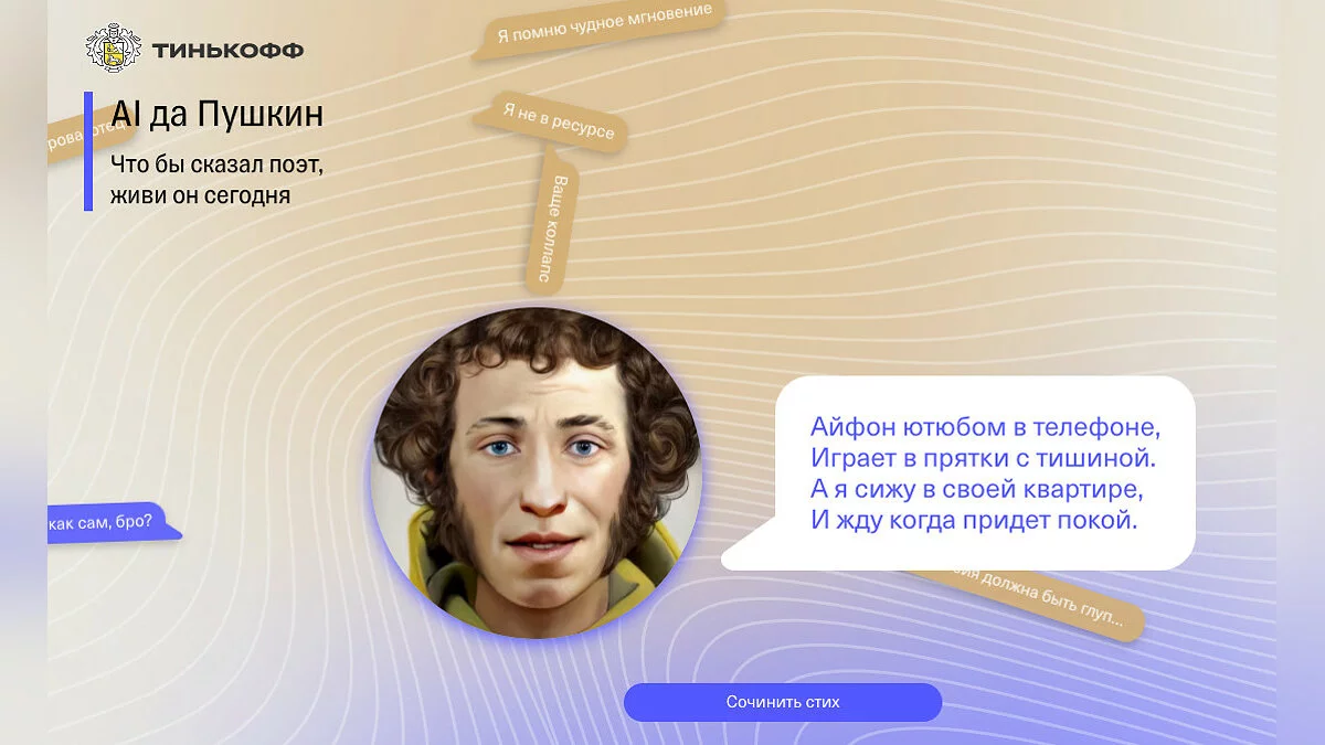 Разработчики из банка «Тинькофф» представили новое творение — проект «AI да Пушкин». Эта нейросеть, которая умеет сочинять современные стихи, продолжая их по первой строчке. Также нейропоэт сможет прочитать свежесозданное творение.