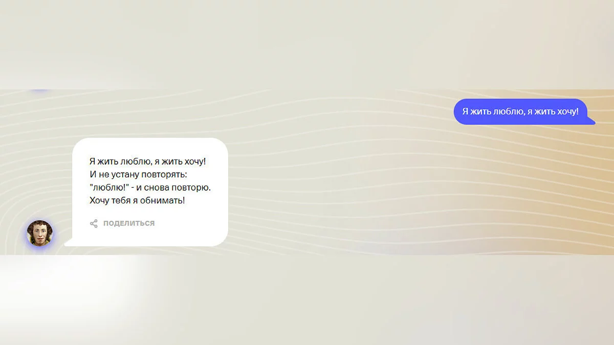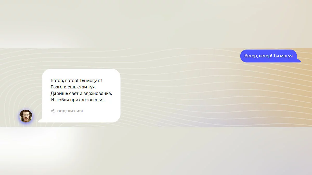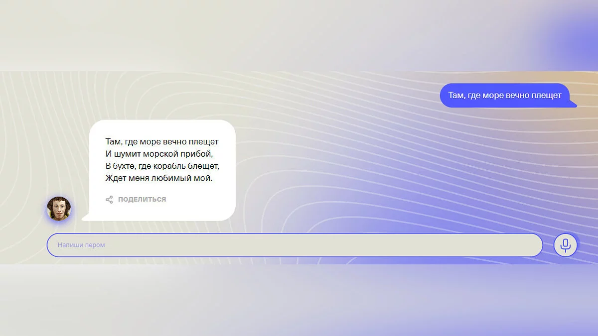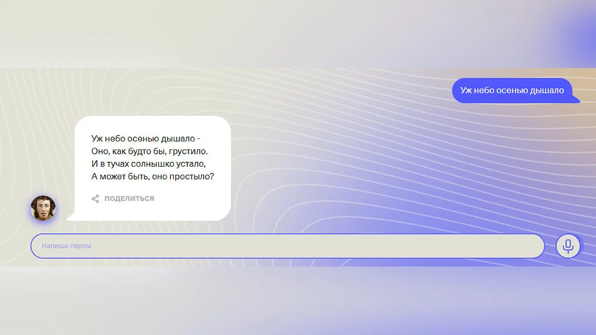 Помимо этого, если ввести несколько строчек подряд, то система предложит прочитать стихотворение вслух. Для этого используется модель, которая соотносит звуки произносимой речи с выражением лица и мимикой виртуального Александра Сергеевича.