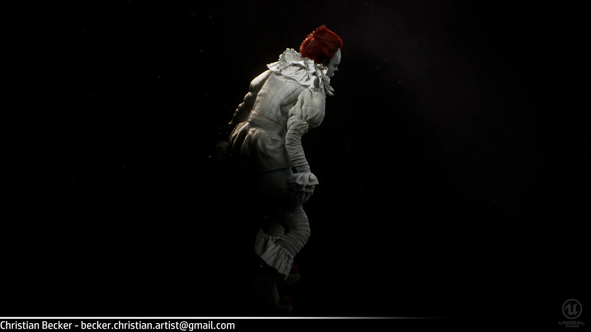 Художник Кристиан Беккер (Christian Becker) с помощью компьютерной графики реалистично воссоздал клоуна Пеннивайза из ужастика «Оно». Для этого он использовал Unreal Engine 4 и такие программы, как ZBrush, Maya, Substance 3D Painter и Photoshop.
