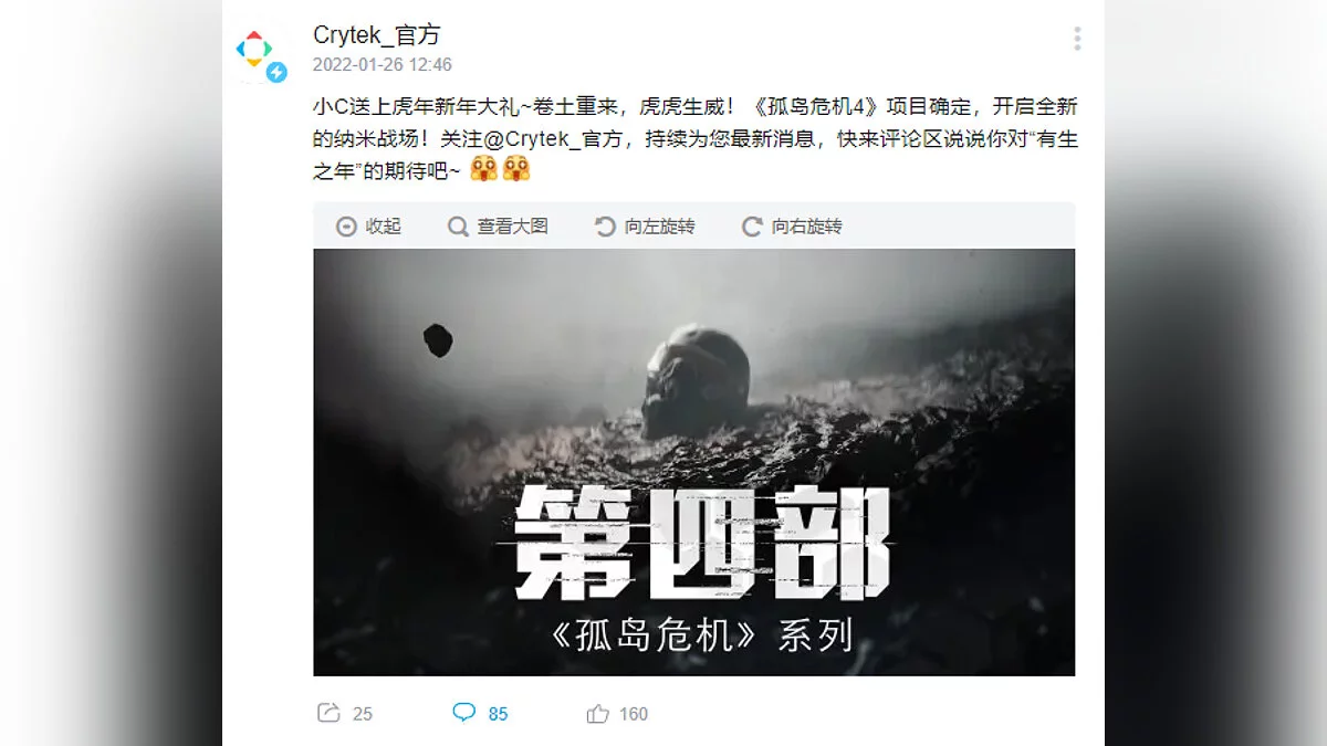 Китайское подразделение Crytek неожиданно анонсировало Crysis 4 и даже опубликовало первое изображение. Пост с анонсом был опубликован в социальной сети BiliBili.