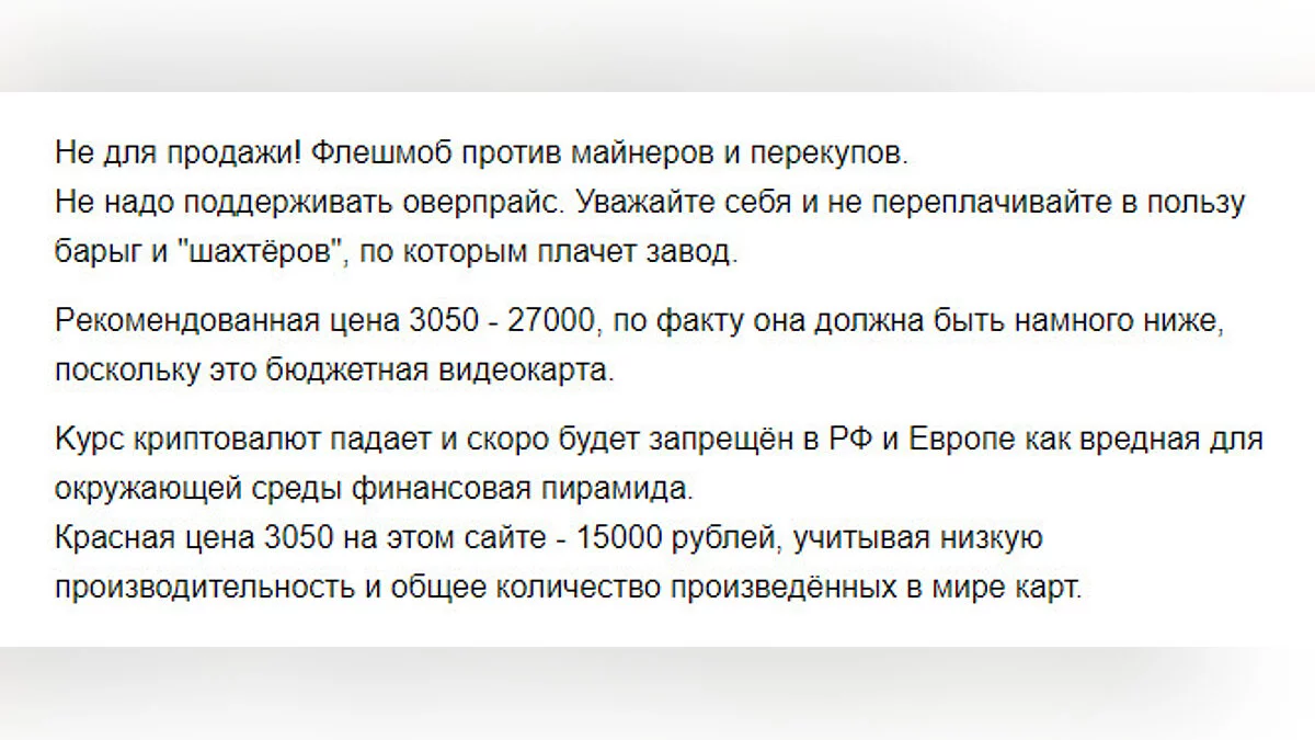 Похоже, что российским пользователям окончательно надоели перекупщики. Потому они решились на радикальные меры — с утра на «Авито» выкладываются объявления о продажах видеокарт RTX 3050 за 25-30 тысяч рублей. Это делается в рамках флэшмоба #антиперекуп.