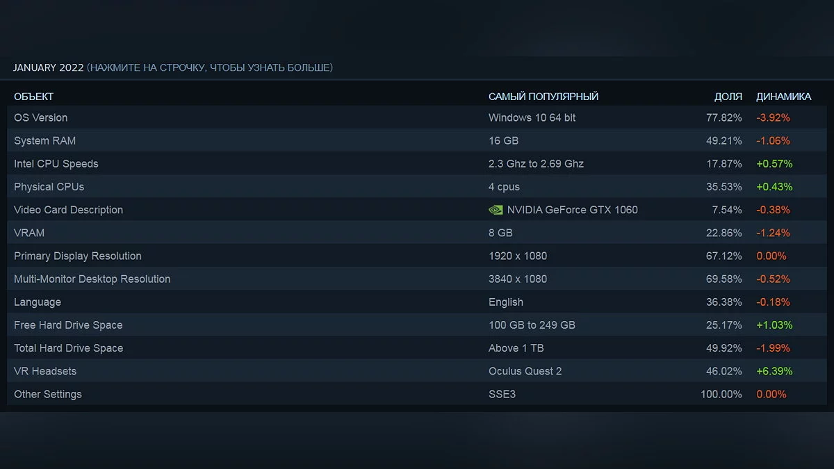 Самой популярной видеокартой остаётся GTX 1060. Её используют 7.5% игроков. Второе и третье место занимают GTX 1650 и GTX 1050 Ti. Самой популярной ОС оказалась Windows 10 (64-бит). На втором месте расположилась Windows 11 (64-бит). Среди шлемов виртуальной реальности наиболее востребованным оказался Oculus Quest 2 (46%). Valve Index находится на втором месте (14%). Подавляющее большинство пользователей Steam (67%) использует разрешение Full HD (1920×1080). 4K-мониторами пользуются всего 2.3% геймеров.