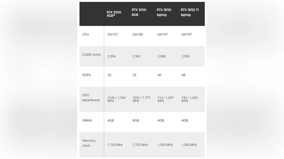 Новинка с тем же названием RTX 3050 может получить видеочип GA107 с меньшей мощностью — 115 Вт вместо 130. При этом она будет основана на более слабом чипе GA107 и получит всего 4 ГБ видеопамяти, а не 8, как нынешняя модель. Хотя ранее говорилось, что снизят только мощность чипа.