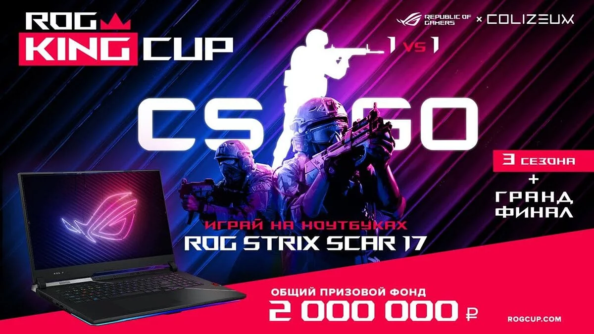 Компания ASUS и бренд ROG вместе с киберспортивными клубами Colizeum проведут в этом году очередной турнир ROG KING CUP по CS:GO. В нём примут участие как профессиональные киберспортсмены, так и простые любители игр. В рамках соревнования разыграют 2 миллиона рублей.