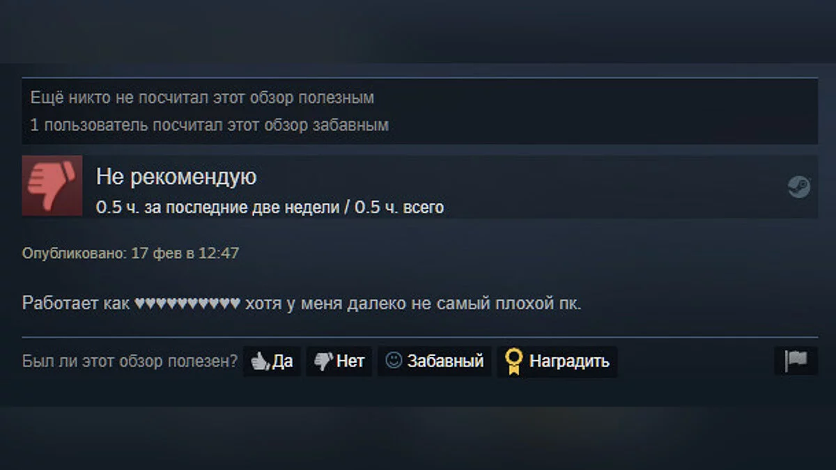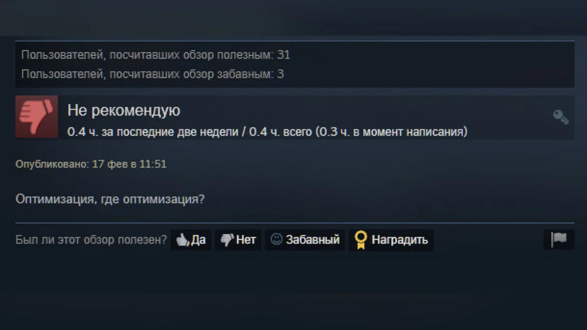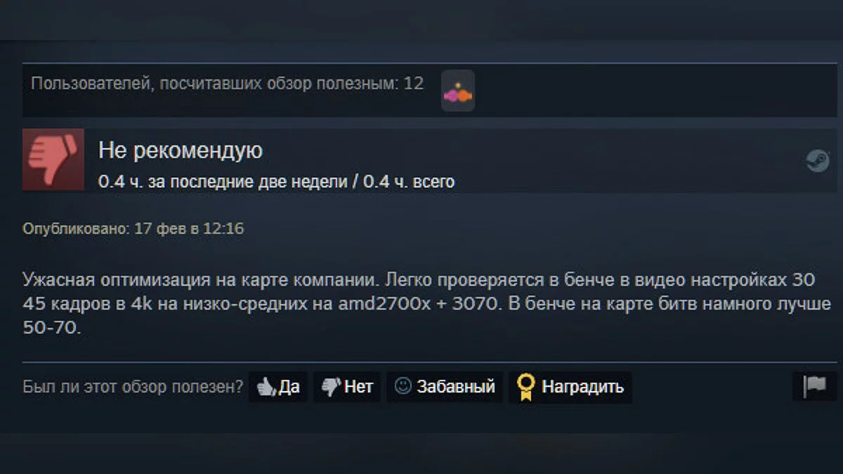 В Steam игру положительно оценили только 46% игроков. Основная и, пожалуй, единственная претензия — плохая оптимизация и баги, которые могут встречаться даже в главном меню.