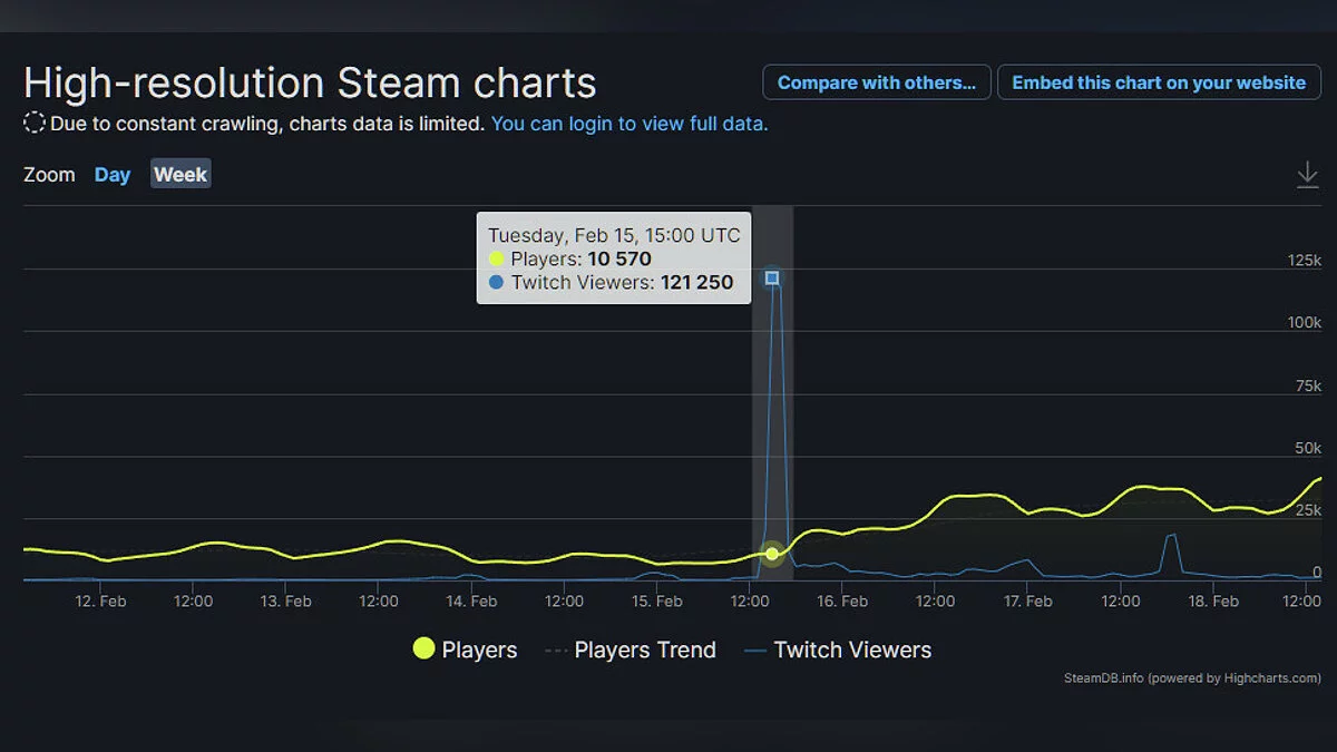 По графикам также можно понять, насколько сильно игроки ждали патча. Видите этот шпиль 15 февраля? Это количество людей, смотревших Cyberpunk 2077 на Twitch в день презентации апдейта.