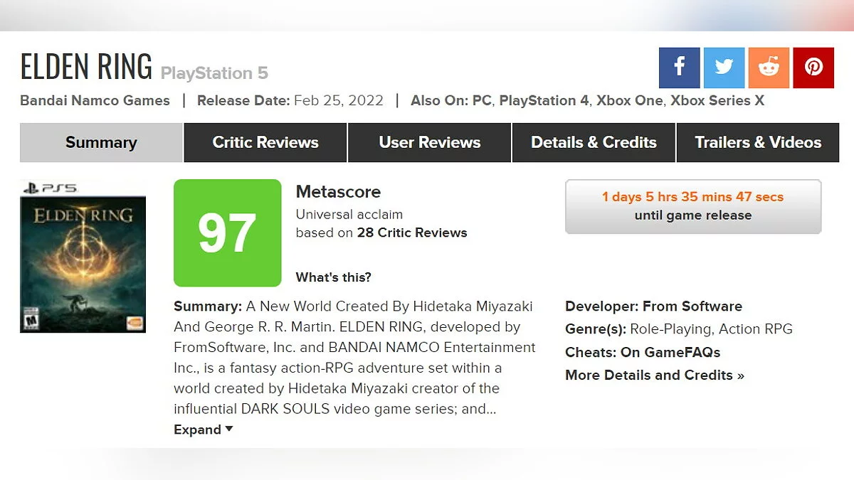 За два дня до релиза Elden Ring спало эмбарго на публикацию обзоров. На Metacritic уже появились первые оценки. На момент публикации новости игра получила 97/100 баллов. В обзорах её называют шедевром, новым стандартом для RPG с открытым миром и главным претендентом на «Игру года».