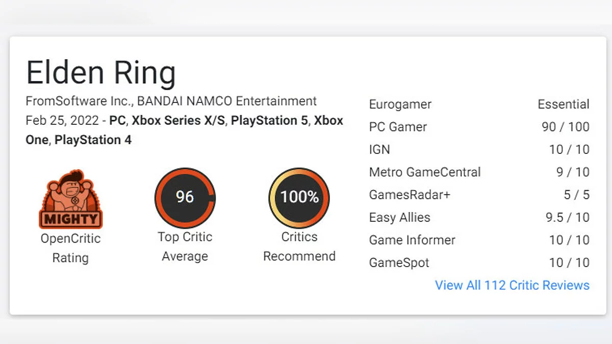 Рейтинг на сайтах-агрегаторах устаканился, можно делать выводы. На OpenCritic у игры 96 баллов на основе 112 рецензий. Это делает Elden Ring второй самой оцениваемой игрой за все время. Вчера она даже ненадолго заняла первое место, но потом уступила Super Mario Odyssey.