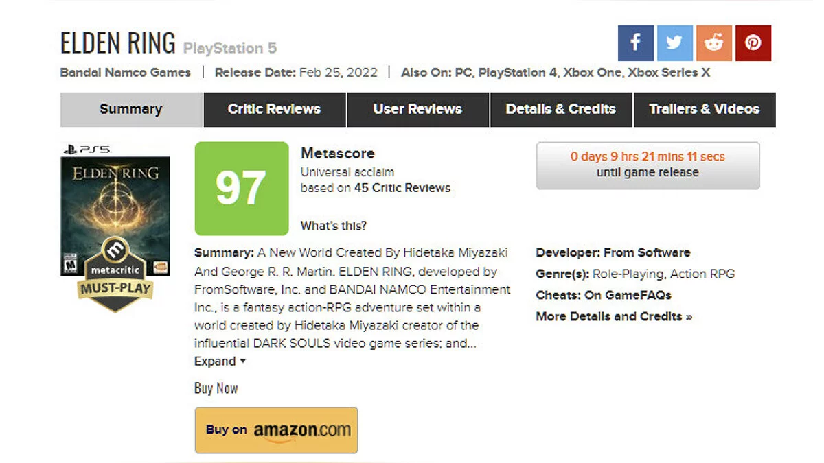 Elden Ring стала второй лучшей игрой за все время на OpenCritic