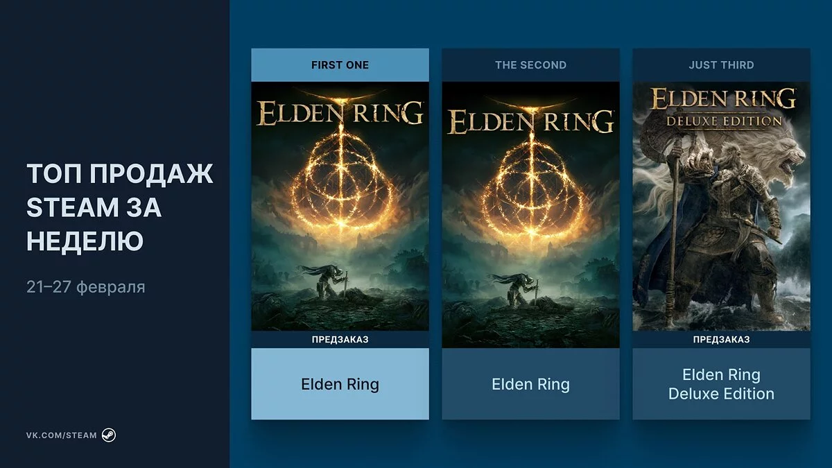 Elden Ring дебютировала с первого места в топе. Другие издания ролевого экшена заняли 2, 3 и 5 места. Дополнение The Witch Queen для Destiny 2 расположилось на 4 и 6 позициях. Консоль Steam Deck дебютировала c 7 места. Стратегия Total War: Warhammer 3 опустилась с 1 на 9 позицию.
