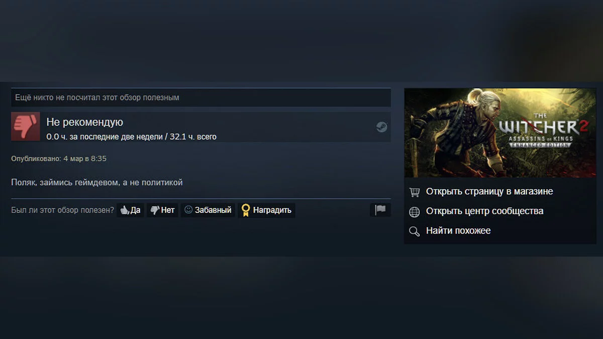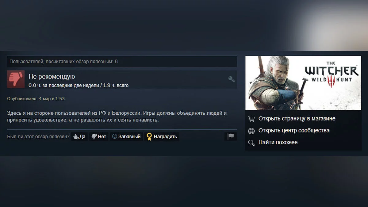 Продолжение: «Геральт не лезет в политику» — китайские игроки громят рейтинг The Witcher 3 и Cyberpunk 2077 в SteamПредыстория: Авторы Cyberpunk 2077 временно прекращают продажи своих игр в России и Беларуси